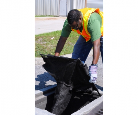 Adjustable catch basin insert quickly re-sizes to fit almost any storm drain – no trimming of excess fabric required.