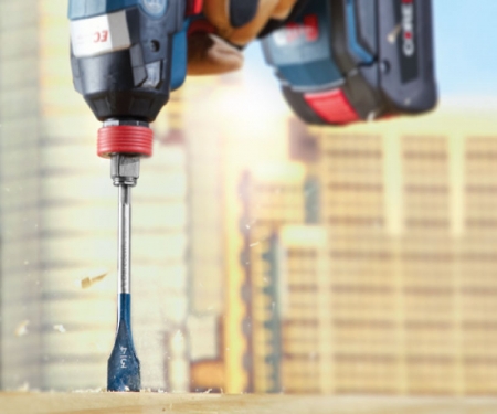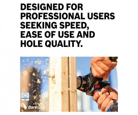 Daredevil™ spade bits are designed for professional users seeking speed, ease of use and hole quality. A full-cone threaded tip pulls the bit through the material with less effort and vibration than other spade bits. The contoured paddle delivers faster chip removal; hex shank with power groove reduces slippage. Up to 10X faster than conventional spade bits.