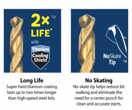 Bosch Titanium-Coated Metal Drill Bits have been designed to satisfy the needs of HVAC or facility maintenance technicians, contractors and other pros who need solid, reliable bits for general-application drilling in high-carbon steel and light-gauge metal, as well as wood and plastic. The split-point tip has been engineered for no-skate starts and clean, accurate holes. The bit provides 2X longer life than standard drill bits, thanks to the tip design and titanium coating. The three-flat shank design on bits 3/16 In. and larger promotes better gripping and guards against slipping.