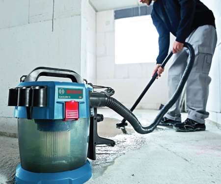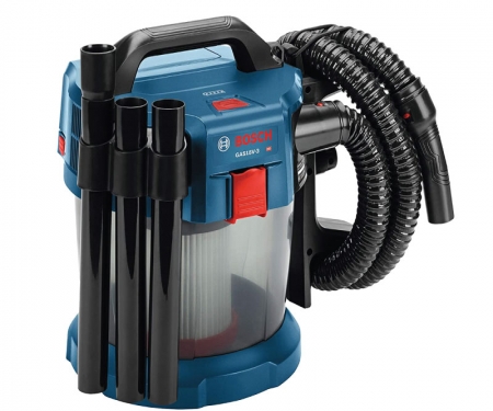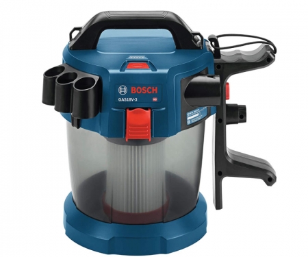 The Bosch GAS18 V-3N 18 V Cordless Wet/Dry Vacuum Cleaner is a convenient solution for cleanup just about anywhere, including shop, jobsite and truck. Working with the Bosch 18 V power system, this cordless vac is built to complete cleanup or emptying chores. With 24 minutes of high-power vacuuming using a Bosch 18 V 6.0 Ah battery, it provides sustained performance with long runtime. This wet/dry vacuum features rotational airflow technology for sustained suction. It delivers up to 51 CFM of airflow. Portable, handy and powerful, this vac weighs 10.2 Lbs. (tool with attachments only, not including battery). It features a washable HEPA filter, which captures 99.97% of particles at 0.3 microns and larger. The cordless wet/dry vacuum features a complete set of attachments. The vacuum cleaner includes a washable HEPA filter, which captures 99.97% of particles at 0.3 microns and larger. The vac also features a complete set of attachments, including three extension tubes, a crevice nozzle and a floor nozzle. When used with the optional Bosch VX120 vacuum hose adapter (sold separately), this vac can be connected with many Bosch power tools and attachments that have dust-collection ports.This is a bare-tool kit; the battery and charger are sold separately.