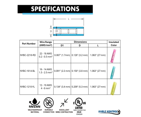 | NYBC-1210-YL | 12 - 10 AWG 4 - 6 mm2 | 0.134" (3.4 mm) | 0.209" (5.3 mm) | 1.063" (27 mm) | Yellow | ||