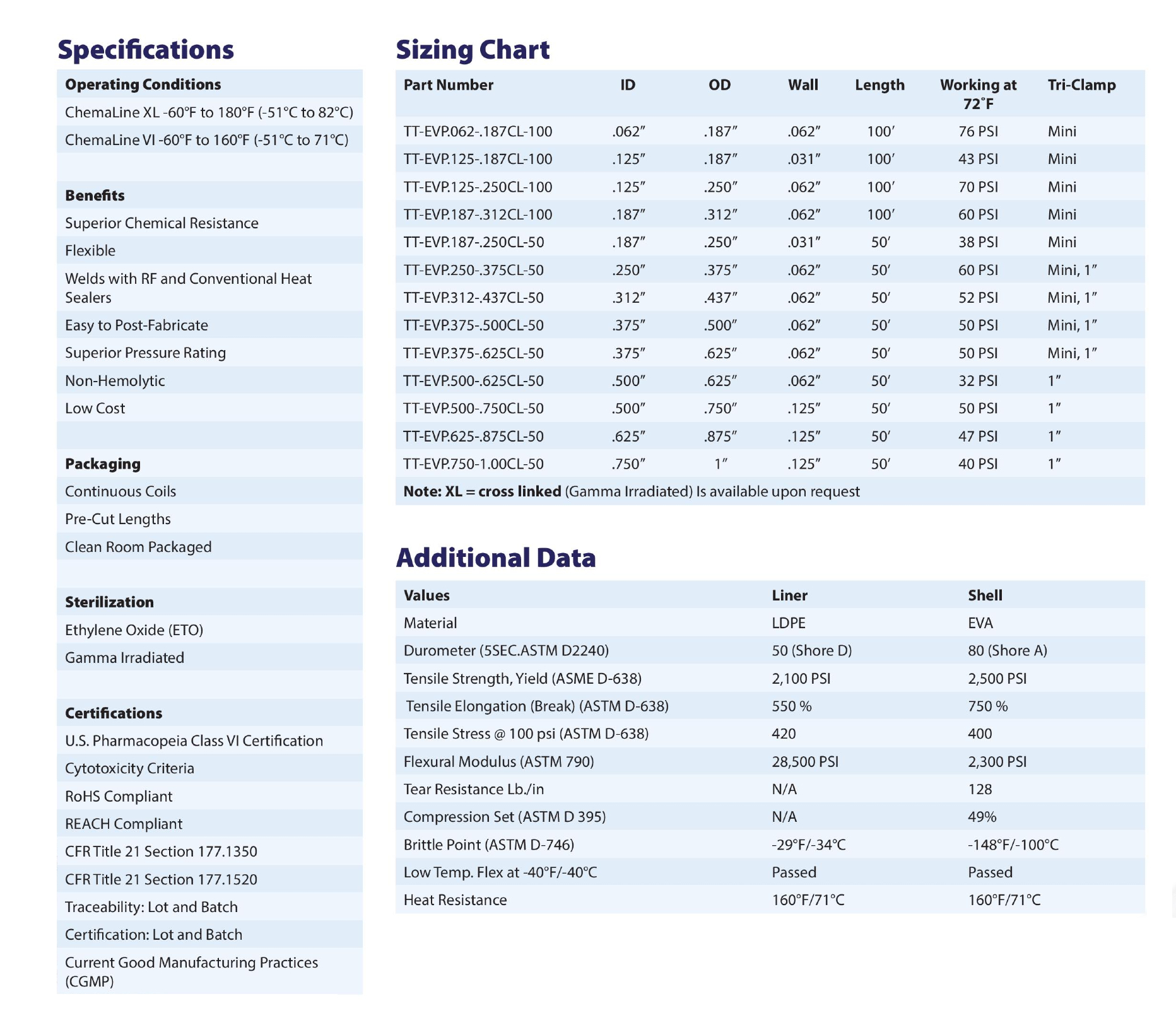 While Chem-A-Line and Chem-A-Line XL are made of the same base materials, Chem-A-Line XL is gamma-irradiated, which cross-links the material for even greater thermal, chemical and mechanical performance. Chem-A-Line is certified and it can resist attack from most solvents. It is plasticizer free and REACH compliant. Chem-A-Line has excellent barrier characteristics along with very low gas and liquid permeability. It works well with compression and other types of push-on fittings.