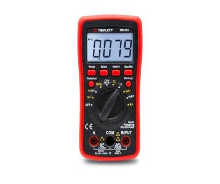 The Triplett Model MM350 True RMS Auto-Ranging Digital Multimeter measures AC/DC Voltage and Current, AC/DC µA Current, Resistance, Temperature, Capacitance, Frequency, Diode, and Continuity. True RMS provides better accuracy when measuring non-sinusoidal or noisy waveforms. It features a 4000 count backlit LCD display, Data Hold, Relative mode, Min/Max, Auto power off, and Low battery indicator. With a CAT III 600V safety rating, the MM350 is well suited for a variety of commercial and residential applications such as security, home theater, electrical, HVAC installations and more. Includes test leads, temperature probe and (3) AAA batteries.