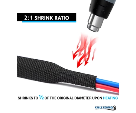Kable Kontrol® Fabric Heat Shrink Tubing is a versatile and durable wire management solution made from a blend of Polyester and polyolefin filaments. It has 2:1 shrink ratio, it shrinks to half its original diameter when heated, ensuring a tight and secure fit. The braided design offers exceptional flexibility and softness, making it easy to install around hoses and irregular surfaces. With an operating temperature range of -40°C to +125°C and flame retardant properties that self-extinguish within 60 seconds, this tubing is engineered for safety and performance. It also delivers excellent wear resistance and noise reduction, making it ideal for demanding environments. RoHS compliant and easy to trim with sharp scissors, this tubing is a reliable choice for both professional and industrial applications.