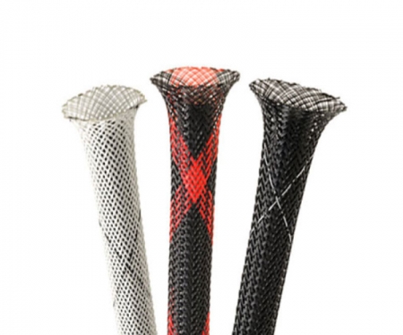 Techflex® Flexo PET Flame Retardant Expandable Braided sleeving is the perfect choice for electronic and high tech applications where flame retardance and durability are primary concerns. Ease of installation makes Flame Retardant Expandable Braided sleeving an efficient choice for long runs of wire or cable. The addition of an organic combustion inhibitor to our standard polyethylene terepthalate gives Flame Retardant Expandable Braided sleeving an Underwriters Lab and CSA flame resistance rating of VW-1. Flame Retardant Flexo PET expandable sleeving is braided from 10 mil polyethylene terepthalate (PET) monofilament yarn that has been compounded with an organic flame spread inhibitor. The sleeving easily expands up to 150% and gently constricts around irregular shapes. It remains flexible over a wide temperature range and is resistant to chemical degradation, UV radiation and abrasion. Flame Retardant Flexo PET is tested and approved for use under FAR 23/25, FMVSS 302, UL and CSA material standards. Additionally, it is in compliance with RoHS, the European directive on the Restriction of Hazardous Substances. It is ideal for a limitless number of electronic, automotive and industrial wire management and bundling applications, wherever flame spread is a primary safety consideration. Examples include engine compartment dressup, home theater wire management, customizing computer case wiring, office wire management, automotive harnesses, and many more. Flame Retardant Flexo PET is available in black with a white crisscross tracer, or white with a black crisscross tracer. These tracer filaments are braided into the sleeving to identify the product as Flame Retardant. The material cuts quickly and cleanly with a hot knife or similar tool, and once installed, will beautify and protect any wire, hose or cable application. To terminate the ends of any application you can use heat shrink tubing, cable ties, hook and loop straps, or plain electrical tape.