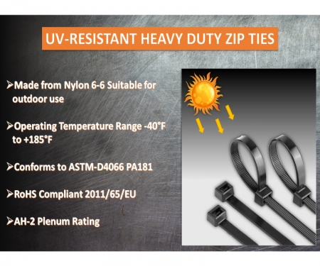 Heavy Duty Black UV Nylon Cable Ties are specifically designed to withstand extra pressure and weight in order to provide you with a more secure bundling ability. Not only are these heavy-duty zip ties made to offer greater strength but they also provide increased resistance to the elements and direct exposure to UV rays from the sun. Most commonly UV black cable ties are used outdoors however they can be used indoors as well.