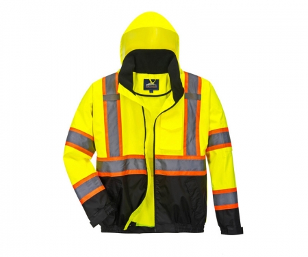 The Portwest US368 Hi-Vis Bomber Jacket with Reflective Contrast Tape is an ANSI Class 3 high visibility, two-tone, black bottom bomber jacket. This jacket is made with 100% 300D Oxford Weave polyester and features a stain resistant PU coating. Waterproof functionality is achieved with sealed seams and a pack away adjustable hood. 2" silver reflective tape with a 4" orange backing aligns the jacket.