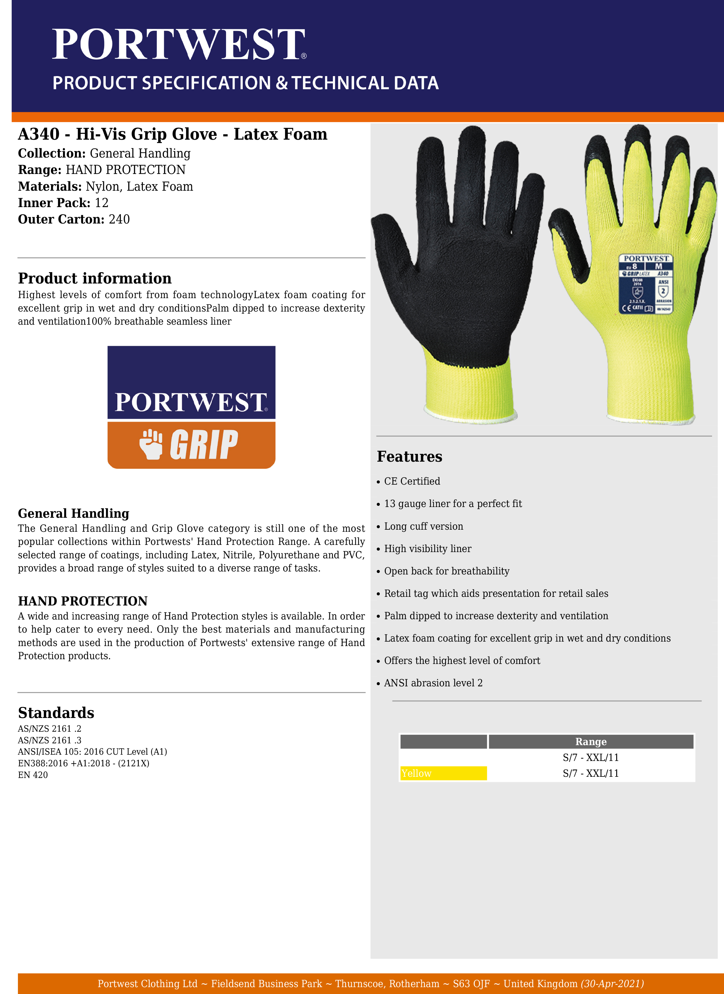 Portwest® Hi-Vis Grip Glove - Latex Foam - A340 Features