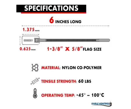 Ensure secure and traceable cable management with Kable Kontrol® Serialized Flag Identification Numbered Cable Zip Ties. Experience the benefits of robust strength, clear identification, and tamper resistance with our premium zip ties. Invest in quality and reliability for your cable identification needs.