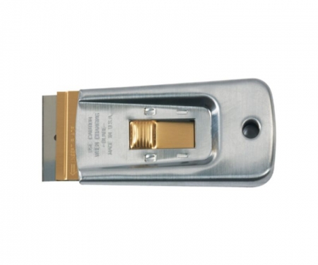 Retractable knife features a heavy-duty, metal construction. Jam-proof, brass slider button locks blade into position.