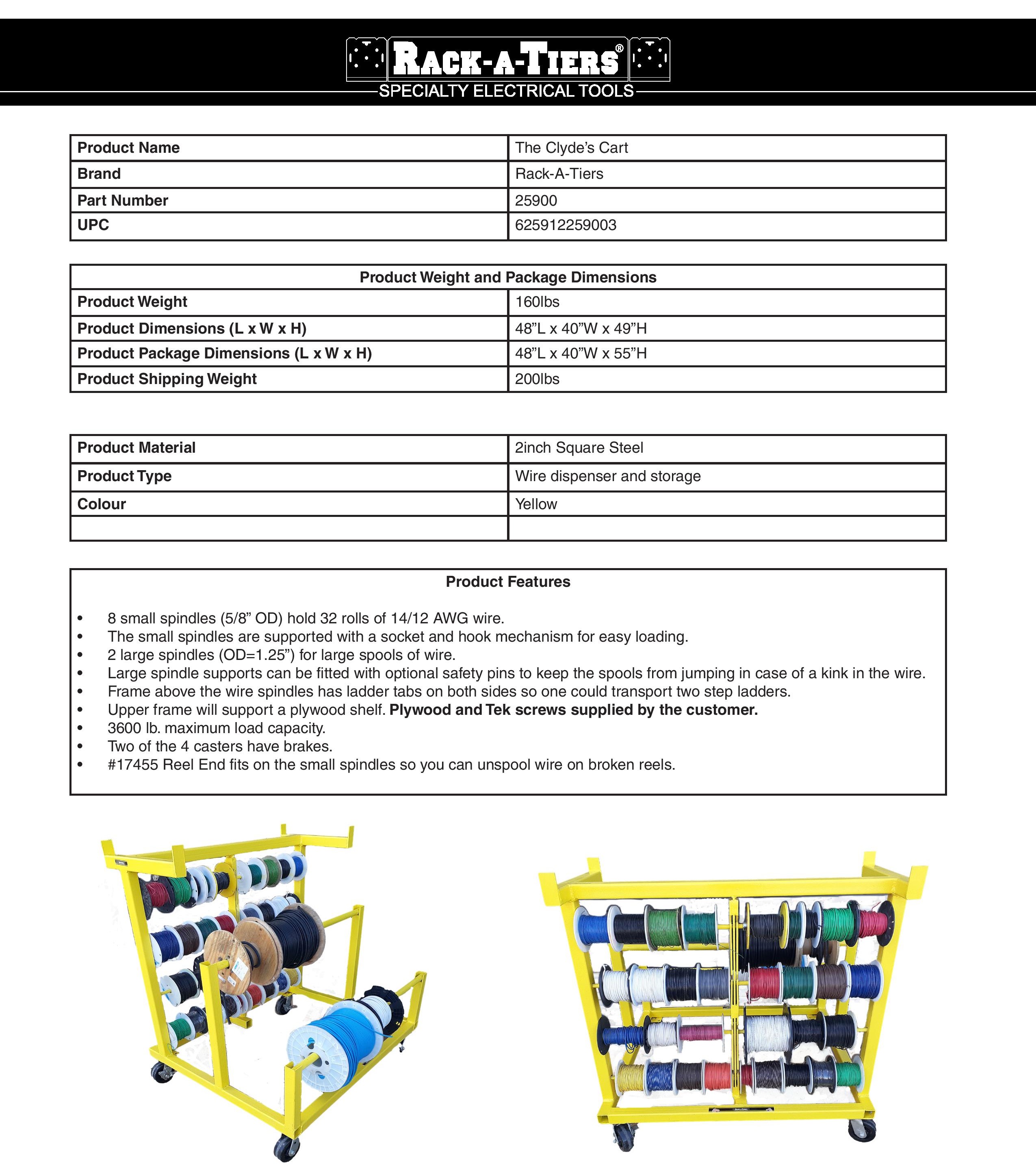 Clyde’s Cart is a large capacity wire dispenser rack on casters. It allows you to store your wire and dispense it when you need. Specifically designed top bracket to accommodate a piece of plywood to convert it into a worktable.