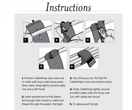 Durable, made of the best quality hook and loop touch fastener...tested for 10,000 closures with no loss of holding strength. Patented.. one end permanently attaches to the cable.. the other end has a pull tab to free the RIP-TIE® with one hand. Used in many industries and in the home - wherever it is important to secure cables, keep them organized, and eliminate cable safety hazards.