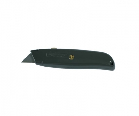 Retractable utility knife has an ergonomic handle with an overlock nose for blade stability. Constructed from high quality, die cast metal.