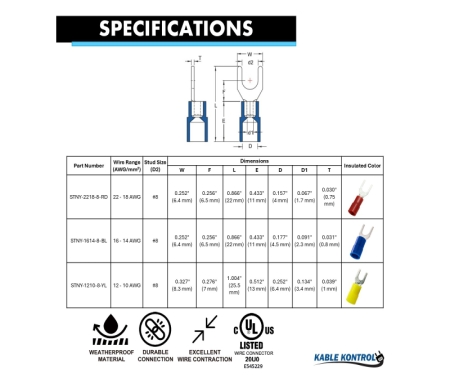 | STNY-1614-8-BL | 16 - 14 AWG | #8 | 0.252" (6.4 mm) | 0.256" (6.5 mm) | 0.866" (22 mm) | 0.433" (11 mm) | 0.177" (4.5 mm) | 0.091" (2.3 mm) | 0.031" (0.8 mm) | Blue | ||||||