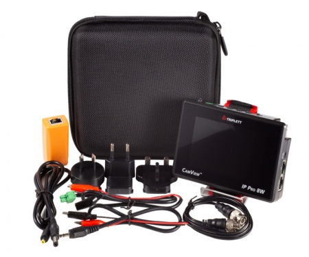 The CamView IP Pro-8W has a 4 inch IPS touch screen monitor designed for the maintenance and installation of IP cameras, analog cameras, TVI, CVI, AHD cameras, as well as for testing 4K H.264 /H.265. The 800 x 480 resolution enables it to display network HD cameras and analog cameras in high resolution. The unit supports ONVIF PTZ and analog PTZ control and is compatible with more than 30 protocols. The combination of touch screen and key buttons make the CamView IP Pro-8W very user-friendly. Other functions include providing 24W PoE power to your camera, PING and IP address searching, LED Flashlight, DC 12V 3A power output and much more. Its portability, user-friendly design and many other functions make the IP tester an essential tool for all installers and technicians. Comes complete with Li-ion battery, AC adapter/charger, BNC/BNC cable, RS485 cable, audio cable, 12V camera power cable, wrist strap, and carrying case.