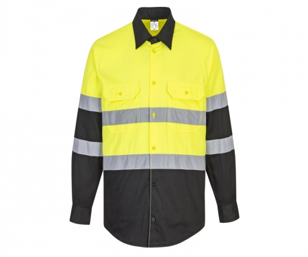 The Portwest E066 Two Tone Long Sleeve Dress Shirt is a Hi vis long sleeve shirt made from Kingsmill: 65% Polyester, 35% Cotton 5.5oz. This work shirt has a vented back to keep the user cool. This long sleeve shirt uses 2” silver reflective tape for added visibility.
