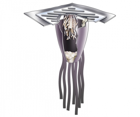Out of sight shouldn't mean out of mind. At least not when it comes to stormwater management. While many of UltraTech's products are designed to prevent pollutants from entering the system through the drain, the catch basin (the part that's "out of sight") shouldn't be ignored. Strips of antimicrobial material, attached to the bottom of this catch basin insert, mix with any standing water present. These coated "tentacles" help resolve issues of bacteria and algae-laden water often found in catch basins.