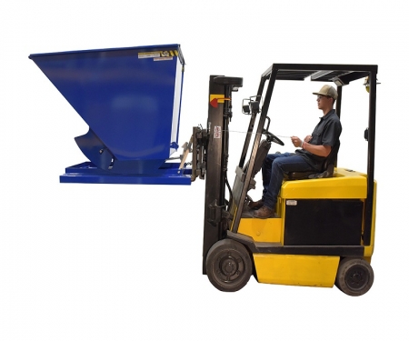 Hopper automatically dumps when bumper release contacts the front of the dumpster. Hopper returns to an upright and locked position automatically after it dumps. Also includes a cable that may be operated from the seat of the fork truck to manually dump the hopper. A safety restraint is provided to secure the hopper to the fork truck. Usable fork pockets are 7-1/2"W x 2-1/2"H. Self-dumping hoppers facilitate compliance with OSHA General Industry rule 29 CFR 1910.178(m)(5)(iii) by allowing lift truck operators to remain at the controls of their truck throughout the dumping process. Optional leak proof design sold separately. D-25, D-33, D-50, D-75, and D-100 are stackable if you stack the top hopper turned 90 degrees from the bottom. Blue baked-in powder-coated toughness is standard.