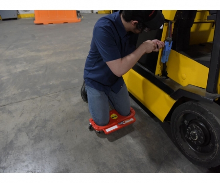 Rolling Knee Dolly, model KNEE-D, is great for people working on their knees. Constructed of red molded plastic with foam cushioned knee cups. Ideal for maintenance departments, automotive garages, and furniture warehouses. Handy tool tray keeps tools in easy reach.