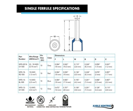 | WFS-14-BL-500 | 14 AWG (2.5 mm²) | 10 | Blue | 0.394" (10 mm) | 0.685" (17.4 mm) | 0.165" (4.2 mm) | 0.291" (7.4 mm) | 0.098" (2.5 mm) | 0.087" (2.2 mm) | ||||||||